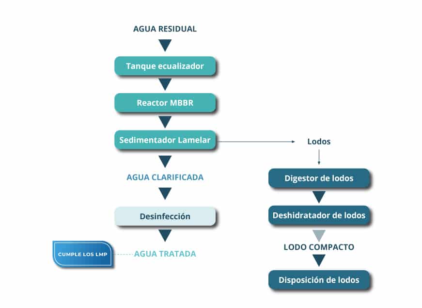 El proceso de tratamiento inicia con un pretratamiento para remover los sólidos finos y acondicionar el efluente para ingresar al reactor biológico, seguido por el tratamiento biológico donde se remueve la carga orgánica y se separan los lodos generados en el decantador secundario. Finalmente, el tratamiento terciario, donde se eliminan los agentes patógenos por desinfección.