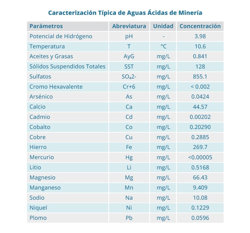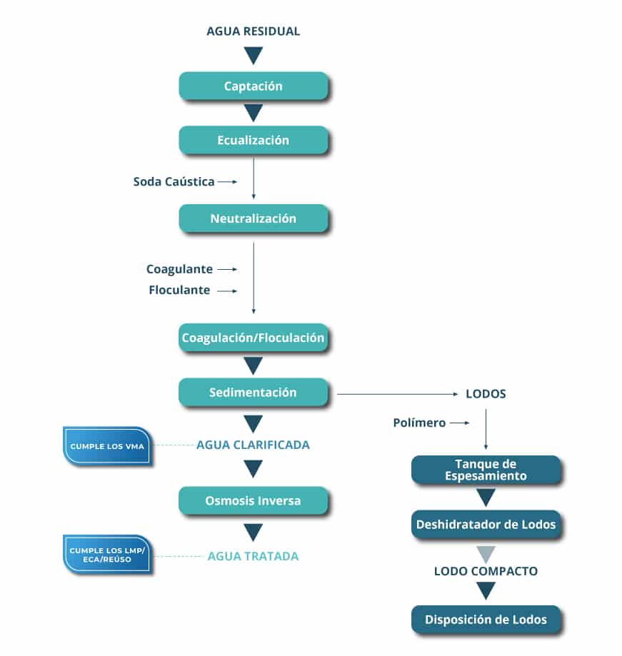 El proceso de tratamiento comienza con la captación de las aguas ácidas de cada una de las áreas que conforman el proceso, posteriormente el efluente es enviado a un tratamiento preliminar, donde se acondiciona el efluente para las siguientes etapas, seguidamente de un tratamiento fisicoquímica para ajustar el pH y remover Sólidos Suspendidos Totales (SST) y finalmente un tratamiento terciario para remover los metales disueltos. Cabe destacar que para cada uno de estos tratamientos existen diferentes tecnologías aplicables según la composición del efluente a tratar.
