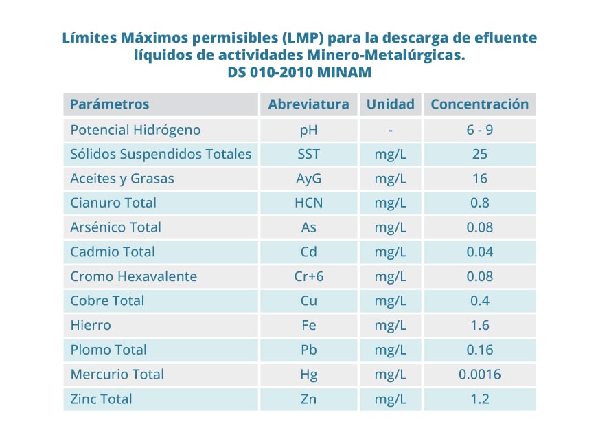 La industria minera, generalmente, vierten las aguas residuales a cuerpos de agua naturales, por lo que estas deben cumplir con los Límites Máximos Permisibles (LMP) para las actividades Minero-Metalúrgicas (DS 010-2010 MINAM). Además, contar con los permisos necesarios para disponerlos de esa forma. También pueden reutilizar sus aguas tratadas con tratamientos más avanzados.